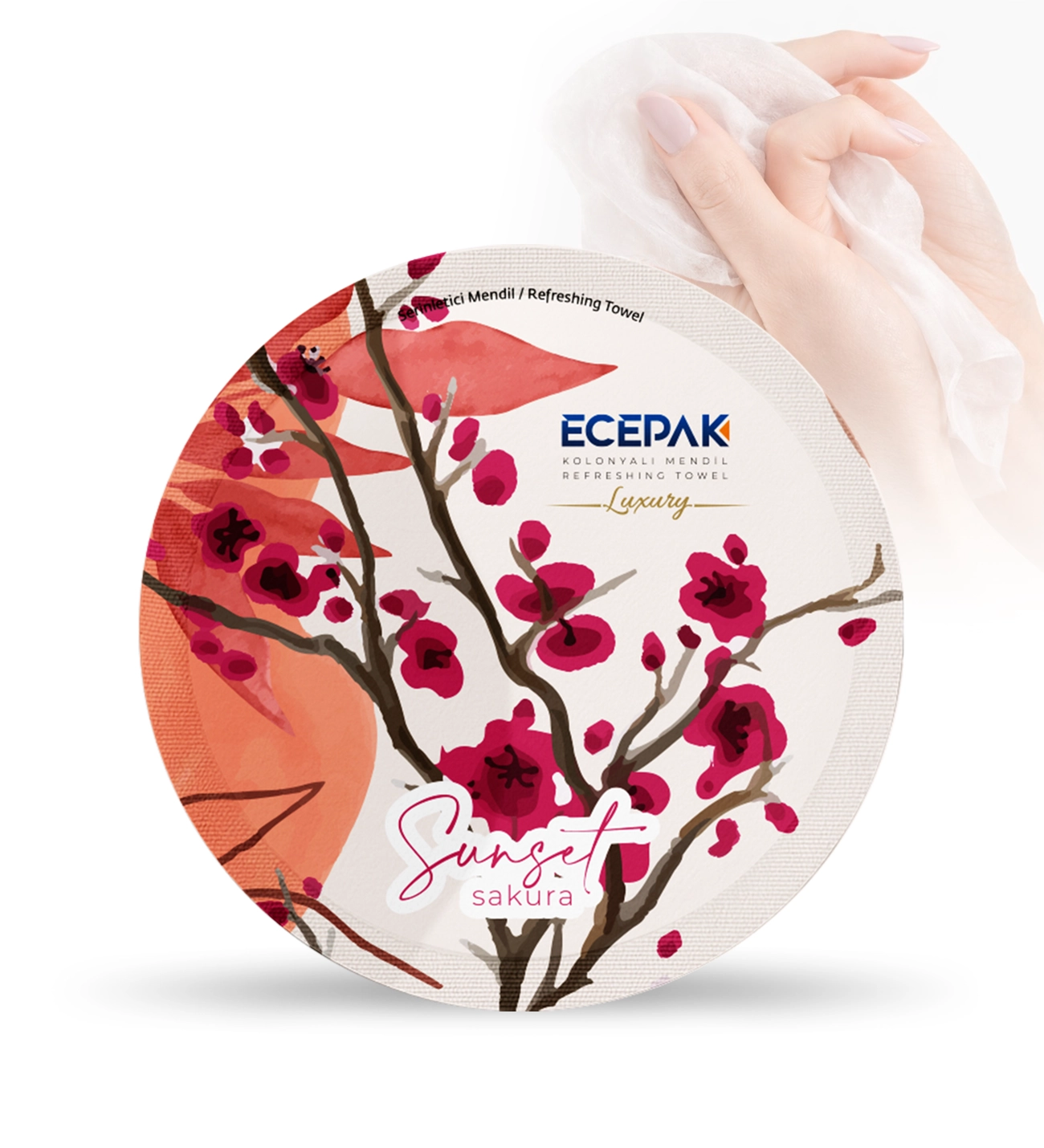 ECEPAK Sunset Kiraz Çiçeği kokulu yuvarlak ıslak mendiller, patentli yuvarlak ambalaj tasarımı, modern görünümü ve güvenilir içeriğiyle hijyen ihtiyaçlarına pratik ve estetik bir çözüm sunar. Tek kullanımlık yapısı sayesinde her ortamda hızlı ve etkili temizlik sağlar.