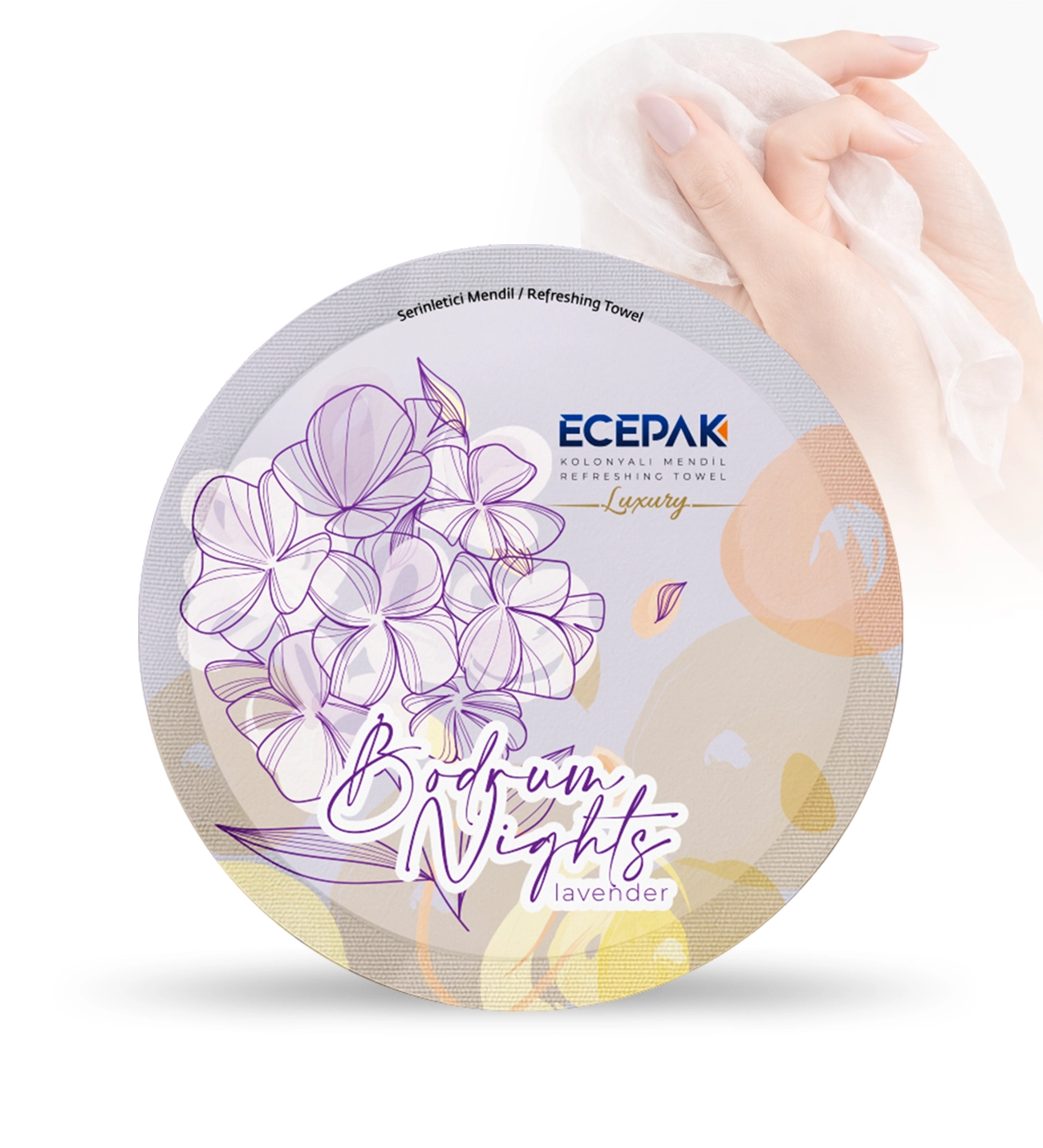 ECEPAK Bodrum Geceleri Lavanta Kokulu yuvarlak ıslak mendiller, patentli yuvarlak ambalaj tasarımı, modern görünümü ve güvenilir içeriğiyle hijyen ihtiyaçlarına pratik ve estetik bir çözüm sunar. Tek kullanımlık yapısı sayesinde her ortamda hızlı ve etkili temizlik sağlar.