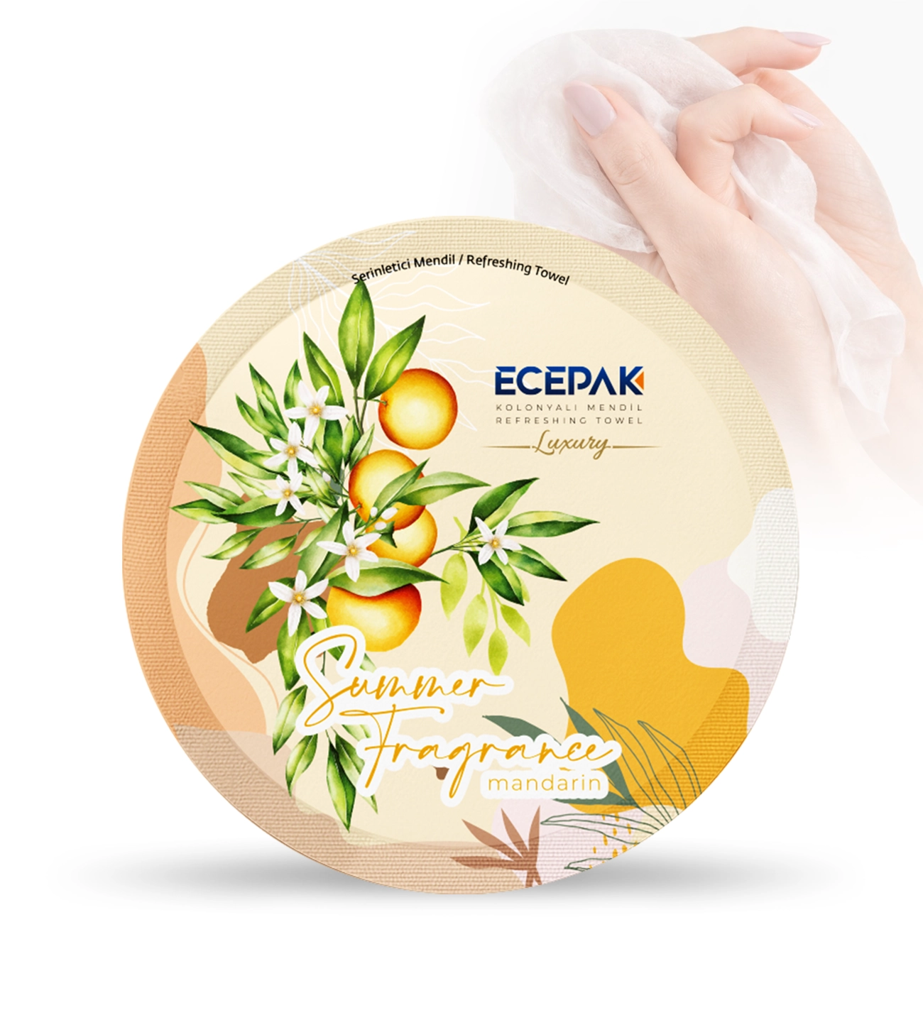 ECEPAK Yaz Mandalina Kokulu yuvarlak ıslak mendiller, patentli yuvarlak ambalaj tasarımı, modern görünümü ve güvenilir içeriğiyle hijyen ihtiyaçlarına pratik ve estetik bir çözüm sunar. Tek kullanımlık yapısı sayesinde her ortamda hızlı ve etkili temizlik sağlar.